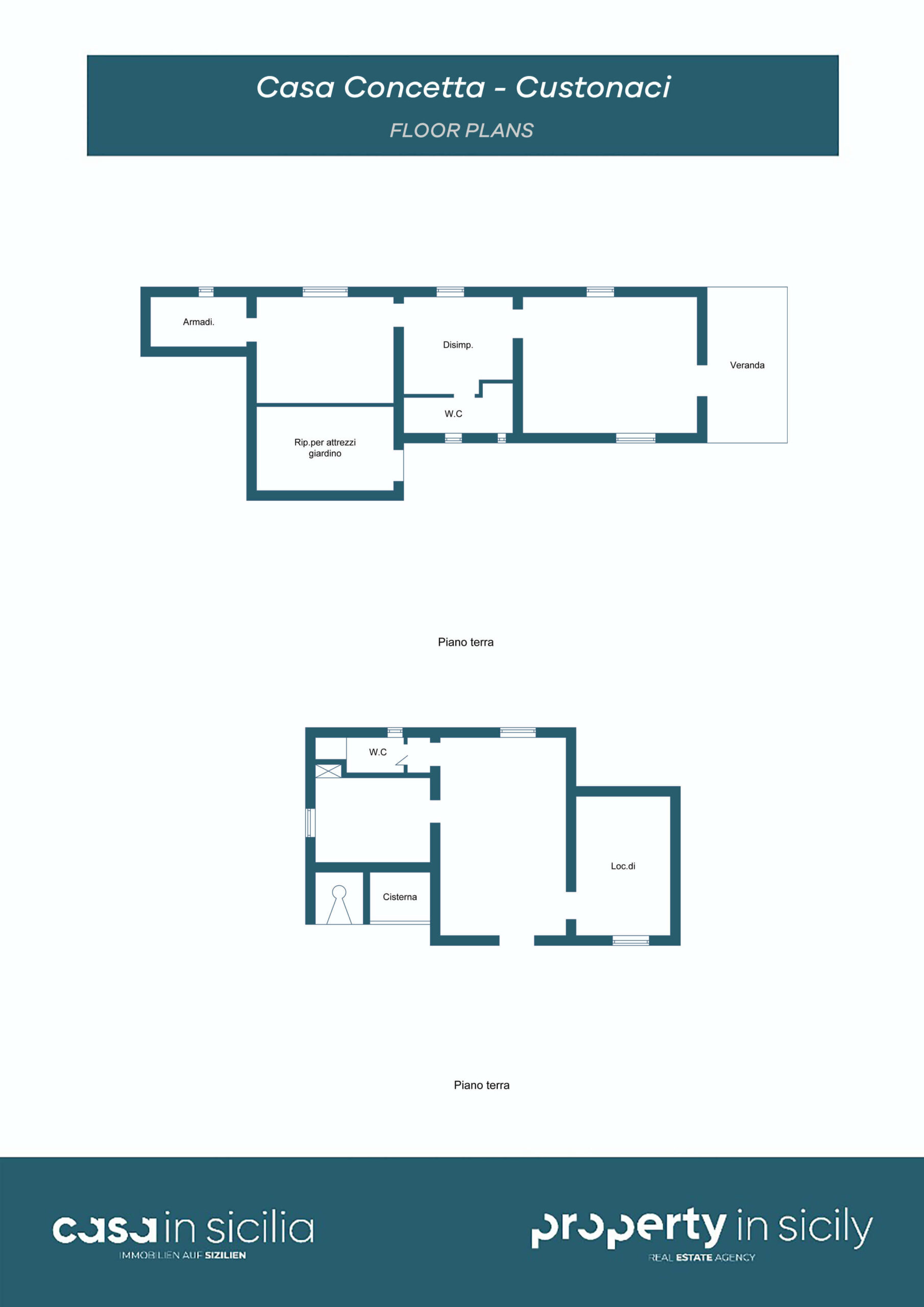 Die beiden sizilianischen Ferienhäuser teilen sich eine Auffahrt und einen Parkplatz für zwei Autos abseits der Straße. In der Mitte des Gebäudes auf der Ostseite befindet sich ein etwa 11 m² großer Außenabstellraum.